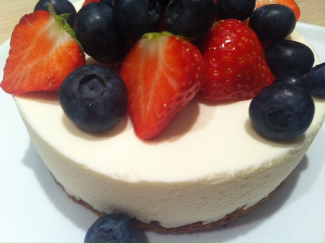 Mens bunden køler tilberedes moussen. Pisk fløden stiv. Varm limesaft og rørsukker til sukkeret er opløst. Læg husblassen i blød i koldt vandt et par minutter og læg den herefter over i limesaften med det vand der hænger ved. Smelt husblassen i limesaften ved svag varme og lad efterfølgende blandingen køle en lille smule ned (det er bedst at der ikke er for stor temperaturforskel ingredienserne imellem). Bland forsigtigt limesaften i creme fraichen og vend til sidst flødeskummen i. Hæld blandingen over mandelbunden og bank/ryst forsigtigt formen for at få en fin glat overflade. Sæt desserten på køl et par timer og server med blandede bær.